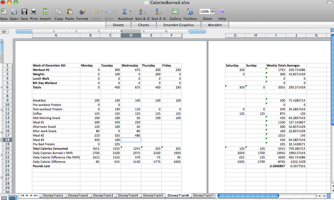 Obviously, I needed a change and I made those changes. As of today I am quickly approaching 180 lbs which is a far cry from the 245 lbs at which I started! One of the amazing things I found after starting this food diary was the effects of one meal on my week. Numbers don’t lie. If the little dial on the scales didn’t go down then I could look back at my spreadsheet and know why. I recorded calories burned as well so I really got into it. After a while I even started changing the font color to red for high calorie meals. This was a visual indicator of what stopped me from being successful in my goal that week. Now if you’ve read my other posts you know that I plan for holidays and enjoy the foods that go along with them. I used to work for the Walt Disney Company so I know all about indulgence! 🙂 But aside from the 10-12 weeks a year when it’s okay (for me) to splurge I try to keep on track with a fairly controlled diet which includes all sorts of foods…foods that support my current training goals whether it be for a marathon, dropping 5 pounds, maintaining my current weight, gaining muscle, etc. I found that if I had a meal that was 800 calories for lunch and I burned 500 calories in exercise then a lot of time I was just going to the gym so I could have french fries that day. Totally not worth it for me since the numbers didn’t add up. Why? Because numbers don’t lie. Eventually I had to discipline myself to change my behavior and my perspective on what constituted a meal. I was way out of whack on my perspective of what size a “meal” should be. Did I need an 800-1000 calorie lunch? No, I didn’t. Did I have to have a salad every day? No, I didn’t. I just needed to make different choice and explore my food options a bit more. Recently I hit a weight plateau so I went back to my calorie diary and started keeping track again. Sure enough, it took me a couple weeks, but the pounds started to come off again. Bam, down another 5 pounds. Numbers don’t lie. So the moral of the story is know what you’re eating, how much you’re eating and the consequences of it all. I found there is a fine line between indulgence & gluttony. If you’re not sure where that line is just look at the numbers because numbers don’t lie. Happy Training & Happy Holidays!